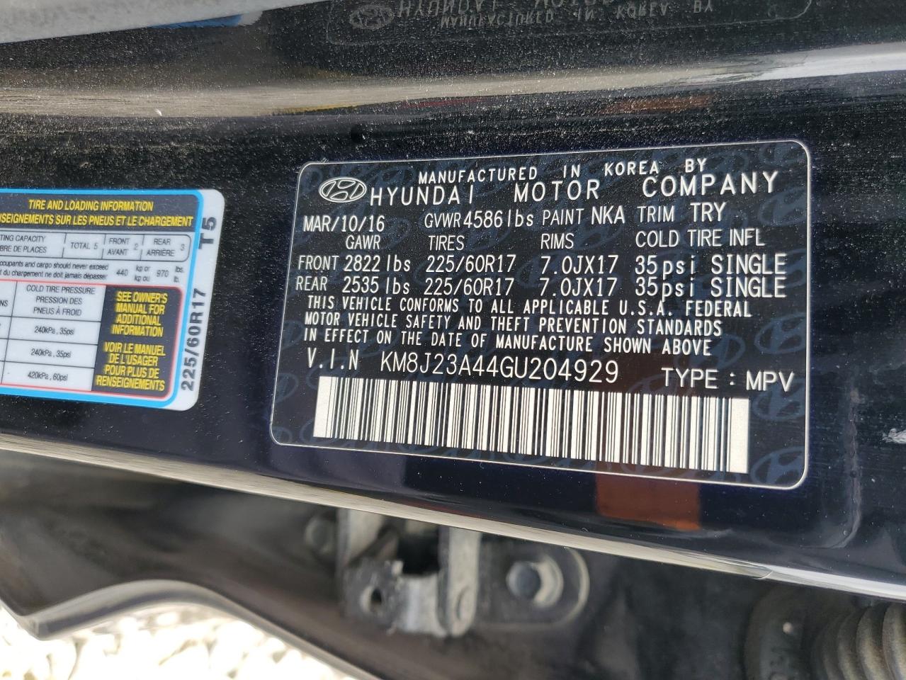 2016 HYUNDAI TUCSON - KM8J23A44GU204929, цвет - Черный, 2.0, Бензин, из США