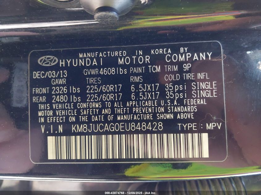 2014 HYUNDAI TUCSON - KM8JUCAG0EU848428, цвет - Черный, 2.4, Бензин, Полный привод из США