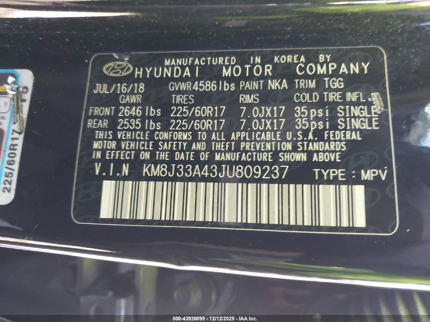 2018 HYUNDAI TUCSON - KM8J33A43JU809237, цвет - Черный, 2.0, Бензин, Передний привод из США