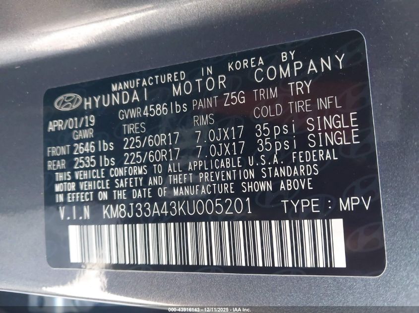 2019 HYUNDAI TUCSON - KM8J33A43KU005201, цвет - Серый, 2.0, Бензин, Передний привод из США