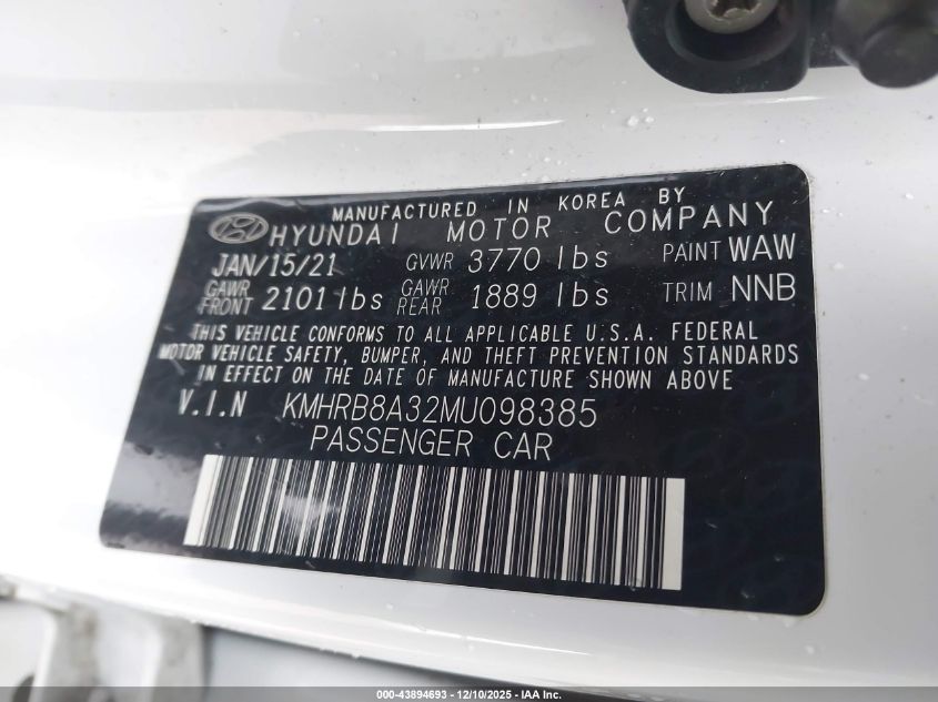 2021 HYUNDAI VENUE - KMHRB8A32MU098385, цвет - Белый, 1.6, Бензин, Передний привод из США