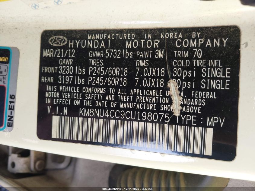 2012 HYUNDAI VERACRUZ - KM8NU4CC9CU198075, цвет - Белый, 3.8, Бензин, Передний привод из США