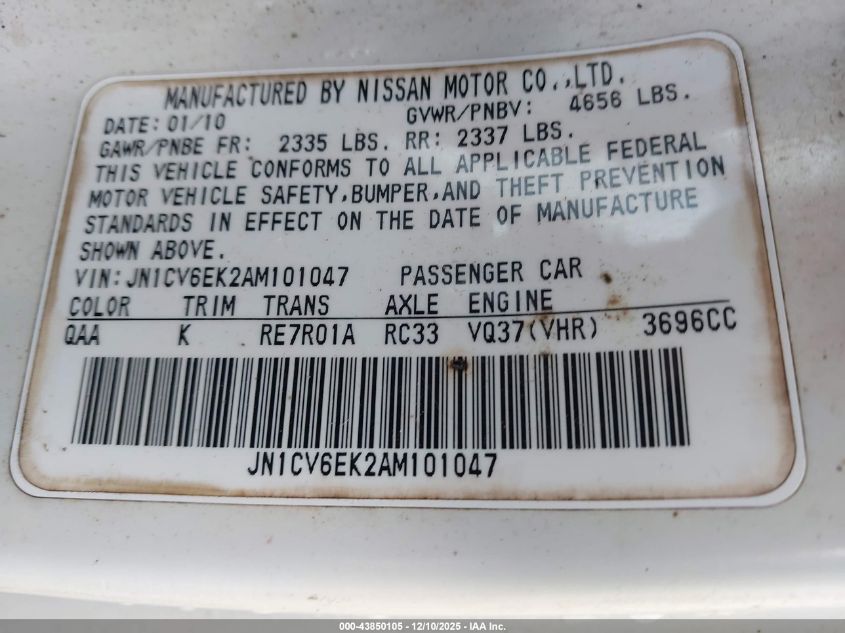 Цвет БелыйЦилиндры 6Привод Задний приводVIN JN1CV6EK2AM101047Состояние Заводится и едет (проверено)Повреждения Обычный износДата аукциона 2025-12-18