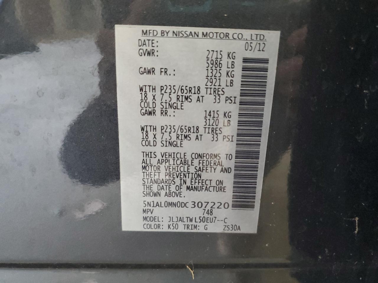 Цвет Древесный угольЦилиндры 6VIN 5N1AL0MN0DC307220Состояние НеизвестноПовреждения Передняя или задняяДата аукциона 2025-10-07