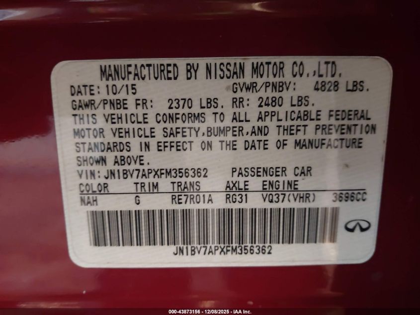 2015 INFINITI Q50 - JN1BV7APXFM356362, цвет - Бургундия, 3.7, Бензин, Задний привод из США
