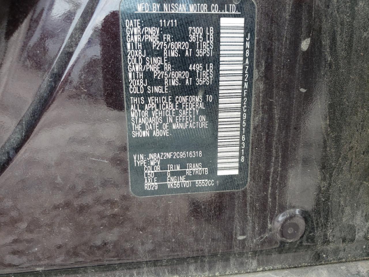 2012 INFINITI QX56 - JN8AZ2NF2C9516318, цвет - Бургундия, 5.6, Бензин, Задний привод из США