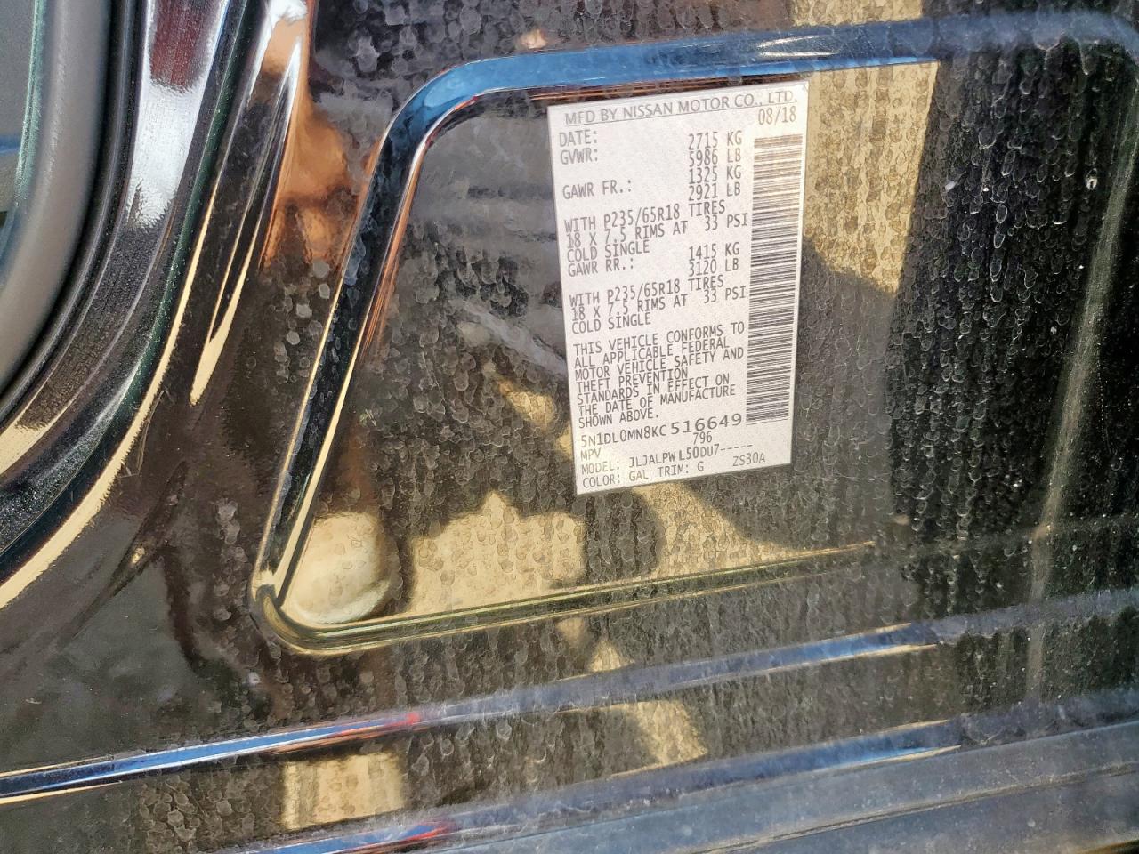 Цвет ЧерныйЦилиндры 6VIN 5N1DL0MN8KC516649Состояние НеизвестноПовреждения ЗадняяДата аукциона 2025-10-09