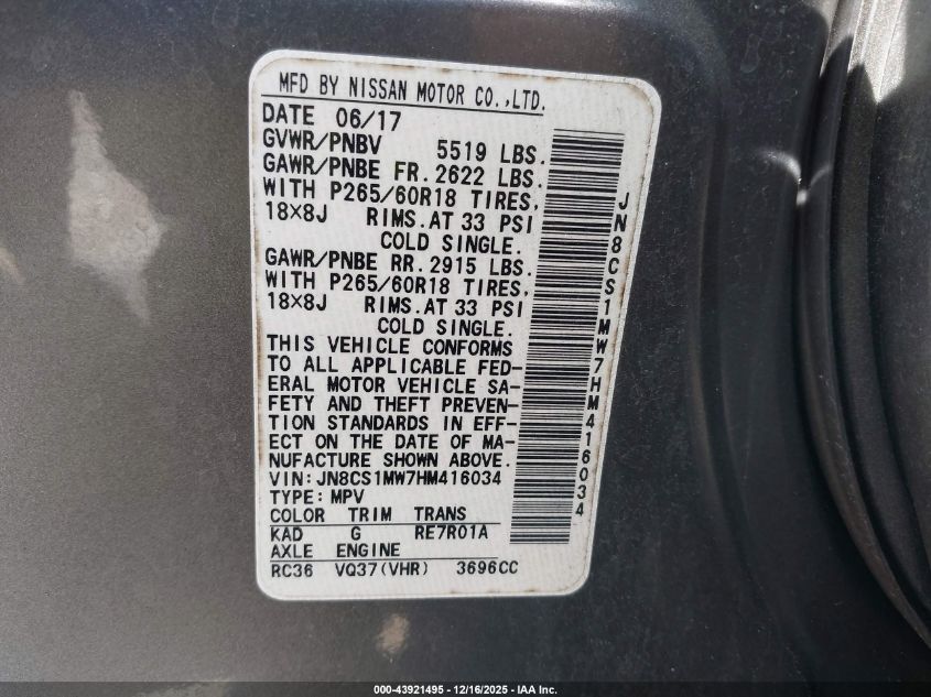 Цвет СерыйЦилиндры 6Привод Полный приводVIN JN8CS1MW7HM416034Состояние НеизвестноПовреждения Передняя или задняя