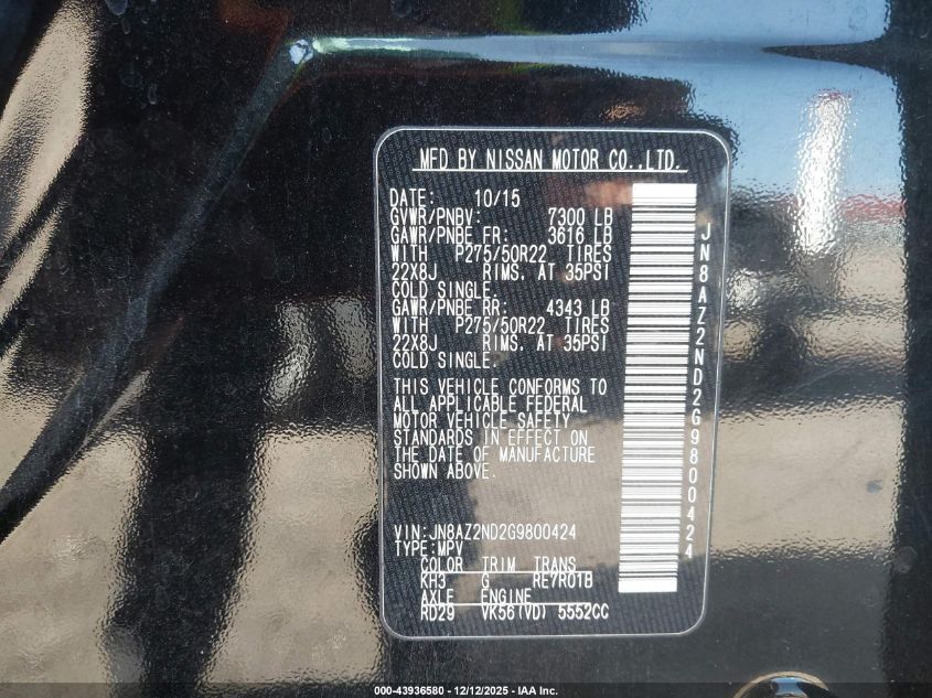 2016 INFINITI QX80 - JN8AZ2ND2G9800424, цвет - Черный, 5.6, Бензин, из США