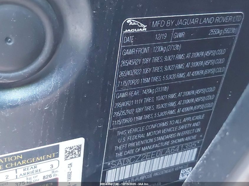 2020 JAGUAR F-PACE - SADCZ2EE0LA641395, цвет - Серый, 5.0, Бензин, Полный привод из США