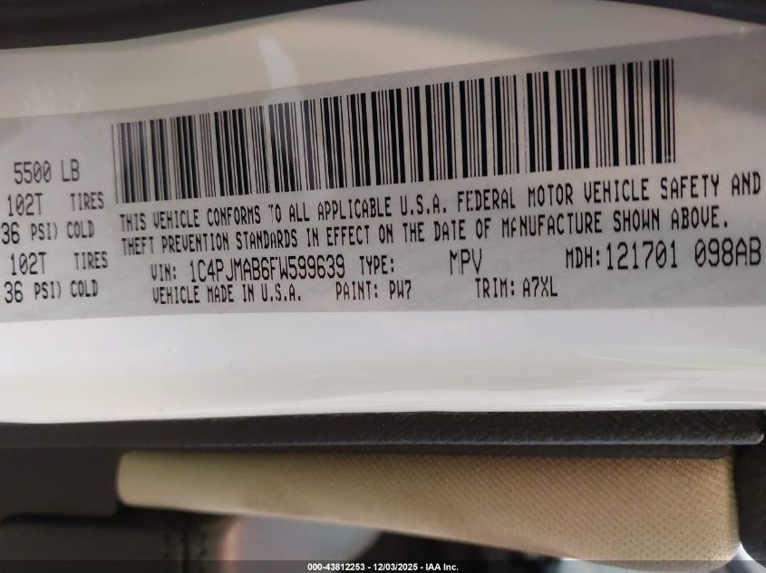 Цвет БелыйЦилиндры 4Привод Полный приводVIN 1C4PJMAB6FW599639Состояние Заводится и едет (проверено)Повреждения Передняя или задняя