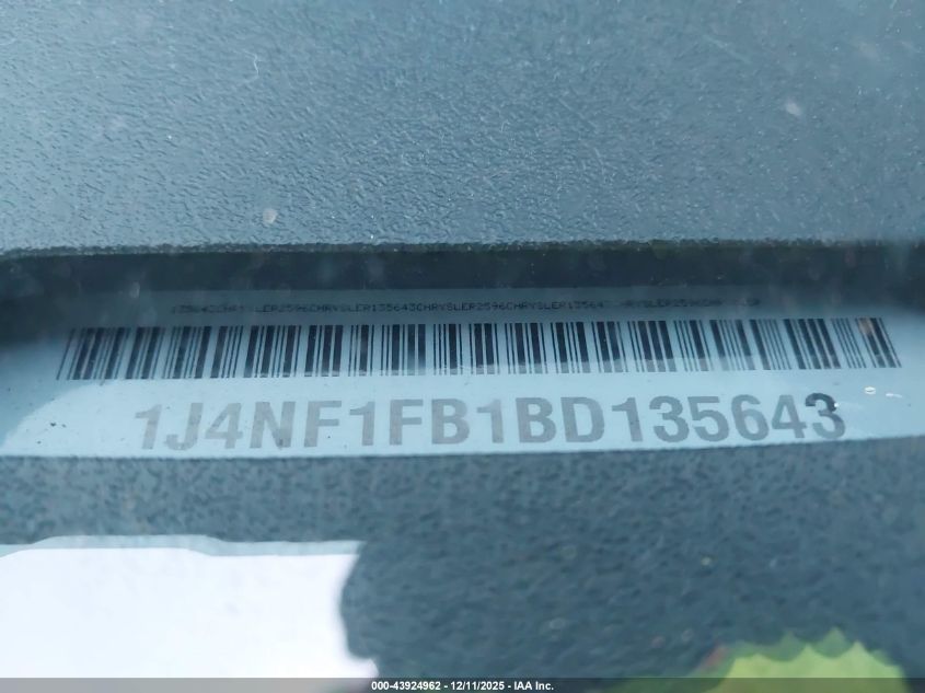 Цвет СеребряныйЦилиндры 4Привод Полный приводVIN 1J4NF1FB1BD135643Состояние Заводится и едет (проверено)Повреждения Обычный износДата аукциона 2025-12-18