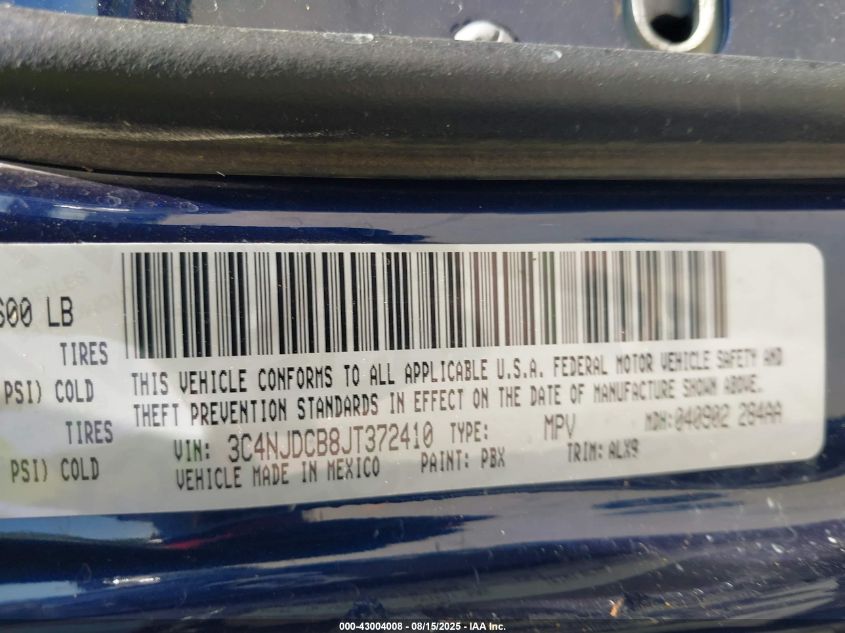 Цвет СинийЦилиндры 4Привод Полный приводVIN 3C4NJDCB8JT372410Состояние СтационарноПовреждения Опрокидывание
