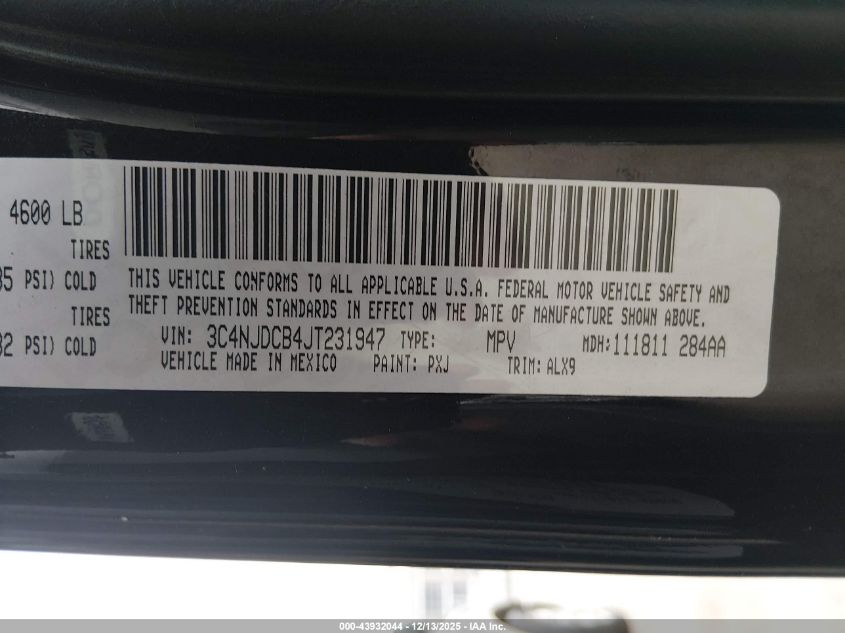 Цвет ЧерныйЦилиндры 4Привод Полный приводVIN 3C4NJDCB4JT231947Состояние СтационарноПовреждения Передняя или задняя