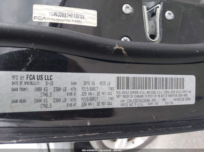 Цвет ЧерныйЦилиндры 4Привод Полный приводVIN 1C4NJDBB7HD139104Состояние СтационарноПовреждения НеизвестноДата аукциона 2025-12-16