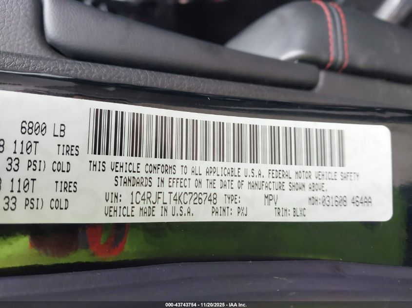 Цвет ЧерныйЦилиндры 8Привод Полный приводVIN 1C4RJFLT4KC726748Состояние СтационарноПовреждения Передняя или задняя