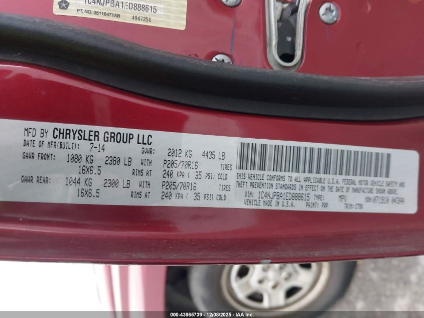 Цвет КрасныйЦилиндры 4Привод Передний приводVIN 1C4NJPBA1ED888615Состояние СтационарноПовреждения Передняя правая