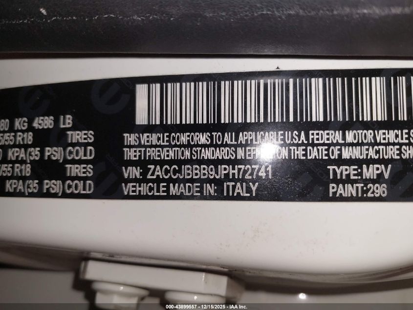 Цвет БелыйЦилиндры 4Привод Полный приводVIN ZACCJBBB9JPH72741Состояние СтационарноПовреждения По бокам