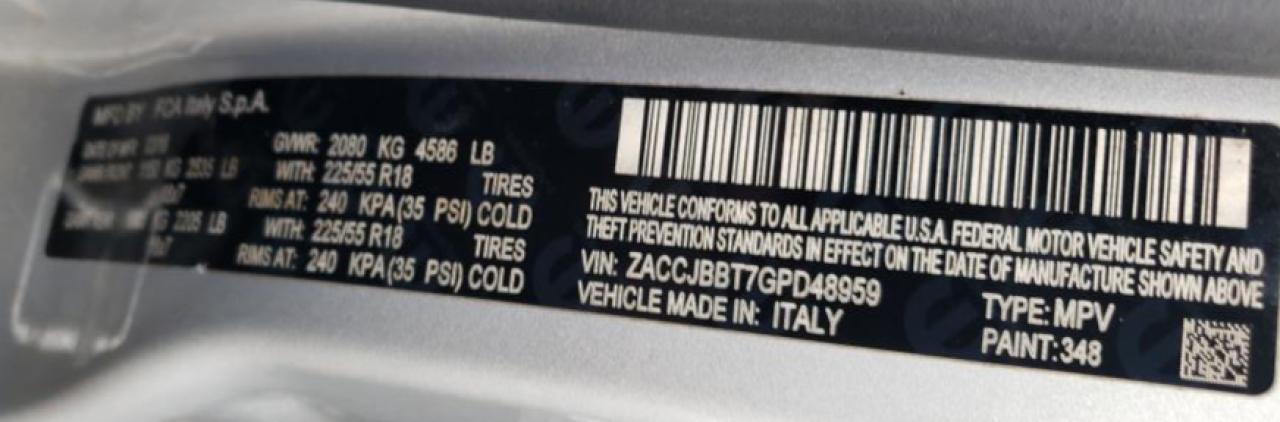 Цвет СеребряныйЦилиндры 4Привод 4x4 с передним приводомVIN ZACCJBBT7GPD48959Состояние НеизвестноПовреждения Незначительные