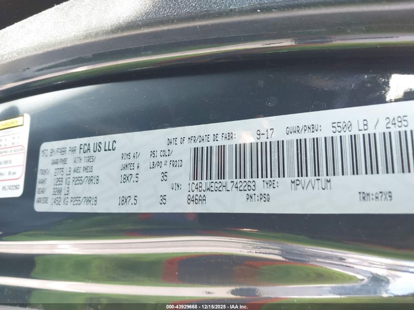 Цвет СерыйЦилиндры 6Привод Полный приводVIN 1C4BJWEG2HL742263Состояние СтационарноПовреждения Опрокидывание