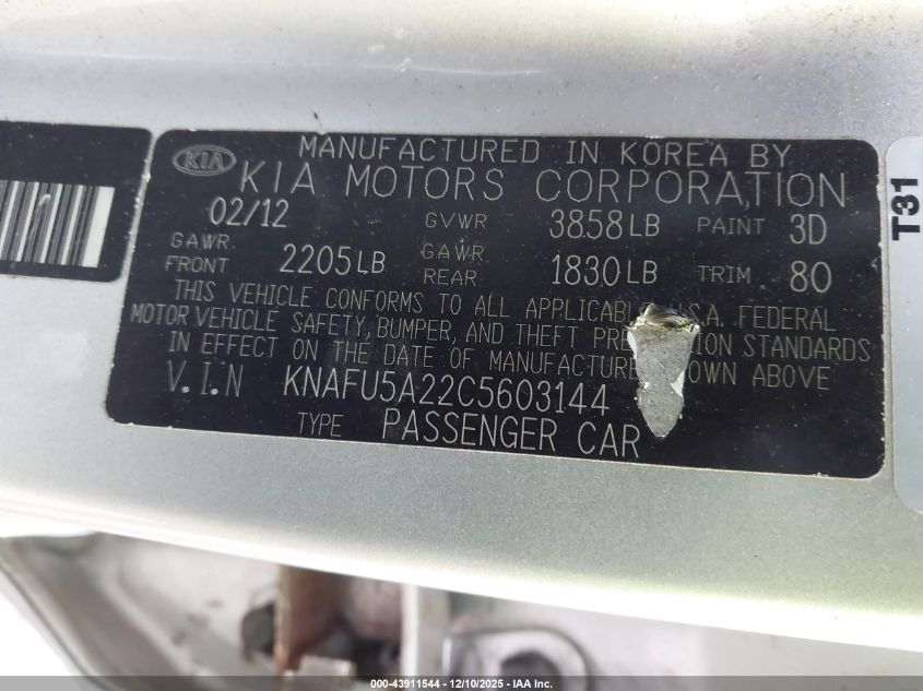 2012 KIA FORTE - KNAFU5A22C5603144, цвет - Серебряный, 2.0, Бензин, Передний привод из США
