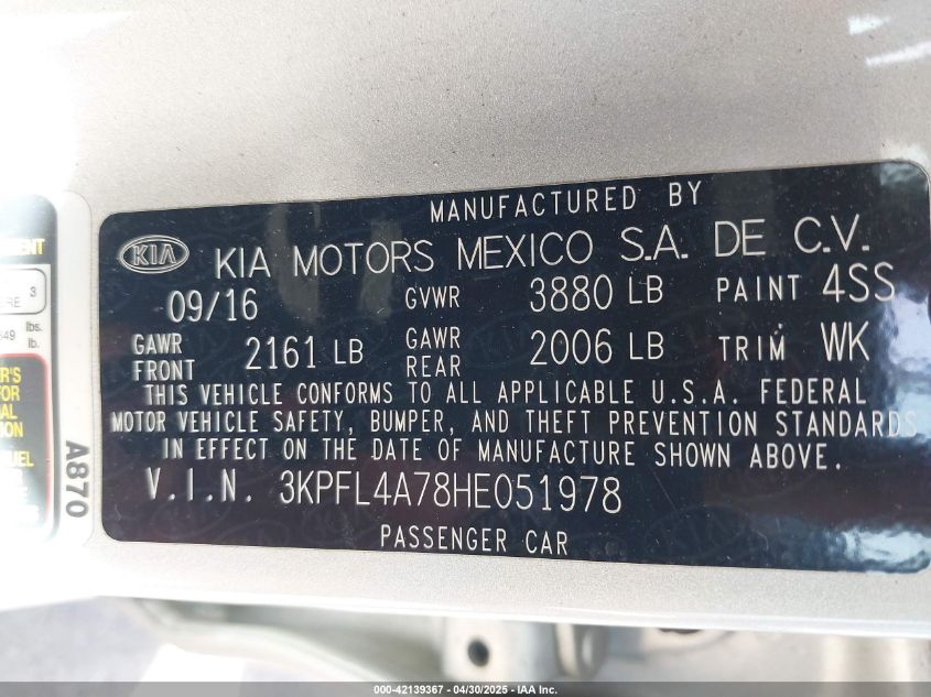 2017 KIA FORTE - 3KPFL4A78HE051978, цвет - Серебряный, 2.0, Бензин, Передний привод из США