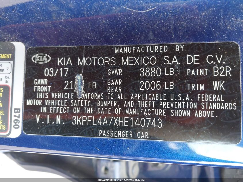 2017 KIA FORTE - 3KPFL4A7XHE140743, цвет - Синий, 2.0, Бензин, Передний привод из США