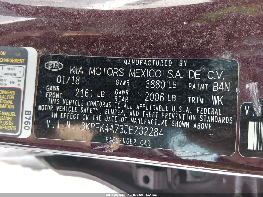 2018 KIA FORTE - 3KPFK4A73JE232284, цвет - Бордовый, 2.0, Бензин, Передний привод из США