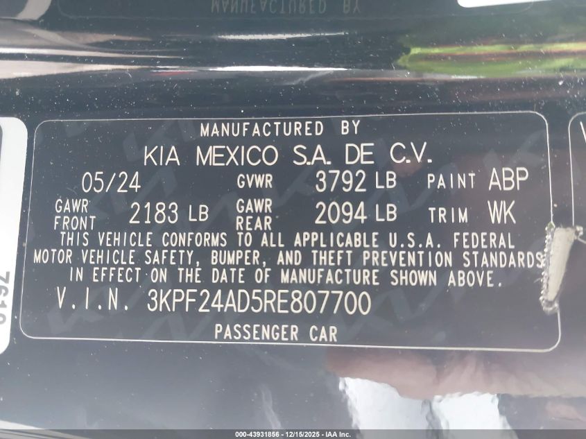 2024 KIA FORTE - 3KPF24AD5RE807700, цвет - Черный, 2.0, Бензин, Передний привод из США