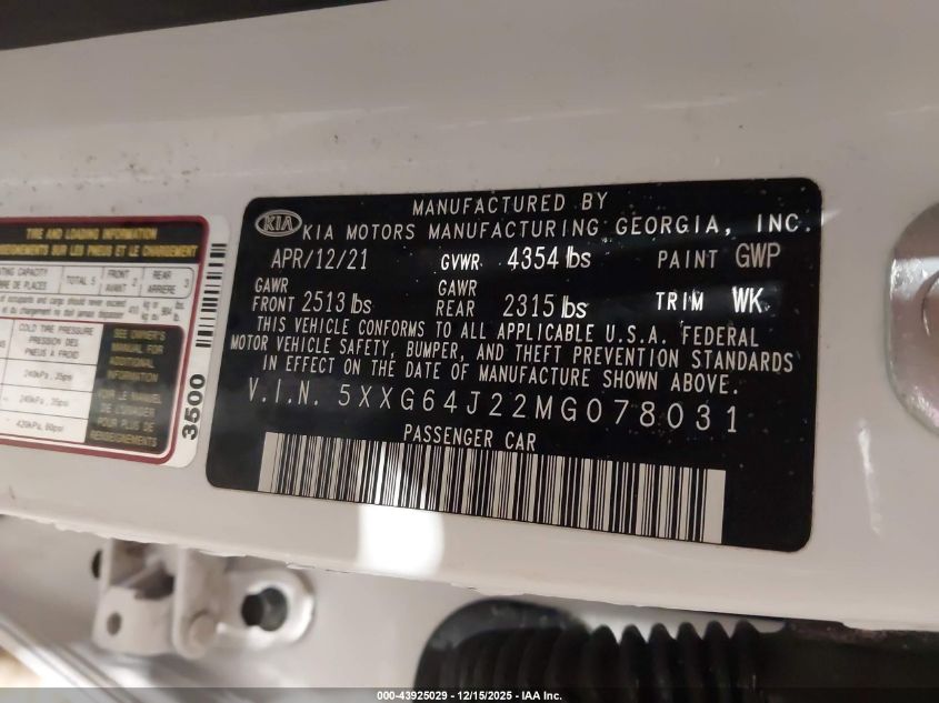 2021 KIA K5 - 5XXG64J22MG078031, цвет - Белый, 1.6, Бензин, Передний привод из США