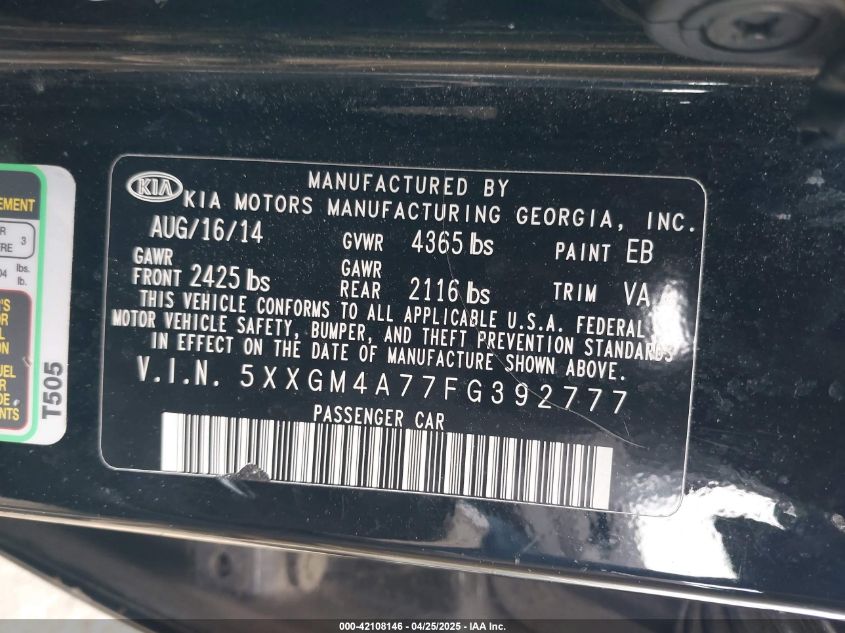 2015 KIA OPTIMA - 5XXGM4A77FG392777, цвет - Черный, 2.4, Бензин, Передний привод из США