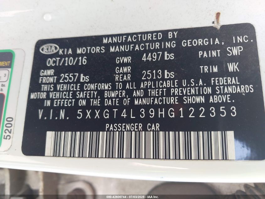 2017 KIA OPTIMA - 5XXGT4L39HG122353, цвет - Белый, 2.4, Бензин, Передний привод из США