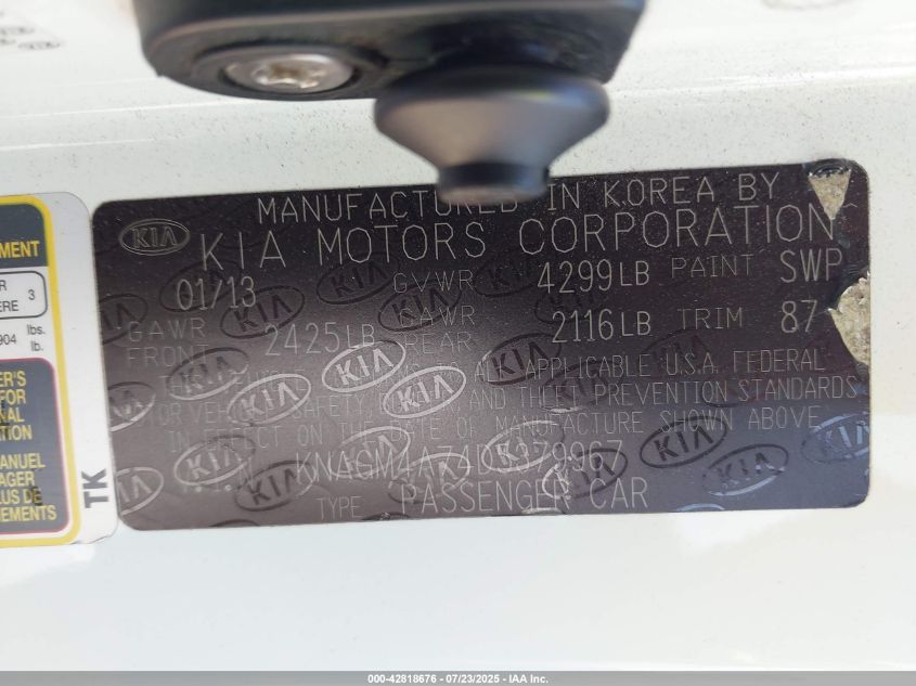 2013 KIA OPTIMA - KNAGM4A74D5379967, цвет - Белый, 2.4, Бензин, Передний привод из США