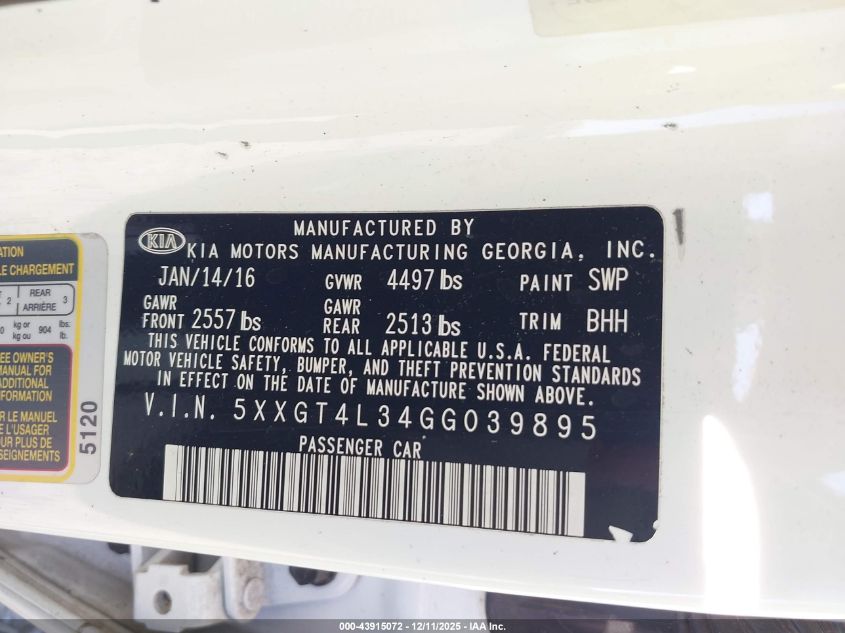 2016 KIA OPTIMA - 5XXGT4L34GG039895, цвет - Белый, 2.4, Бензин, Передний привод из США