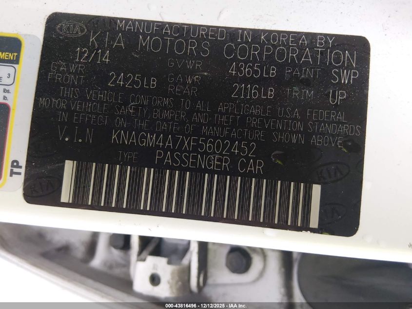 2015 KIA OPTIMA - KNAGM4A7XF5602452, цвет - Белый, 2.4, Бензин, Передний привод из США