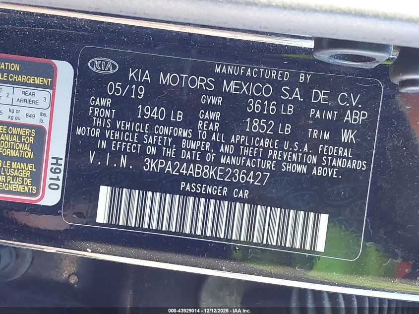 2019 KIA RIO - 3KPA24AB8KE236427, цвет - Черный, 1.6, Бензин, Передний привод из США