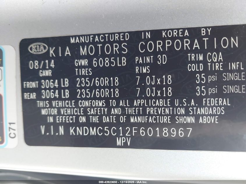 2015 KIA SEDONA - KNDMC5C12F6018967, цвет - Серебряный, 3.3, Бензин, Передний привод из США
