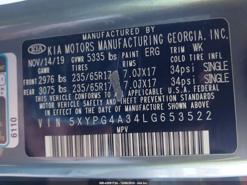 2020 KIA SORENTO - 5XYPG4A34LG653522, цвет - Серый, 2.4, Бензин, Передний привод из США