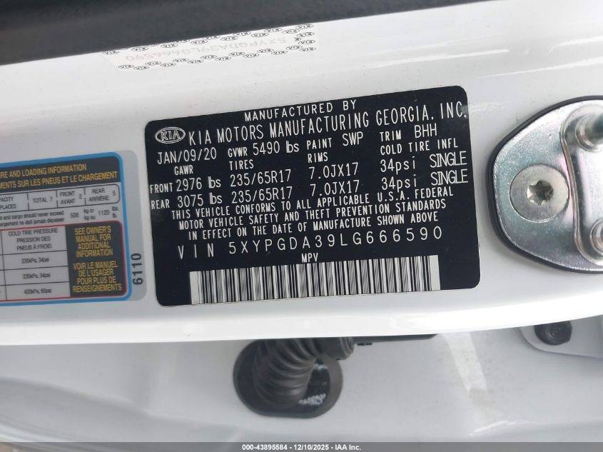 2020 KIA SORENTO - 5XYPGDA39LG666590, цвет - Белый, 2.4, Бензин, Полный привод из США