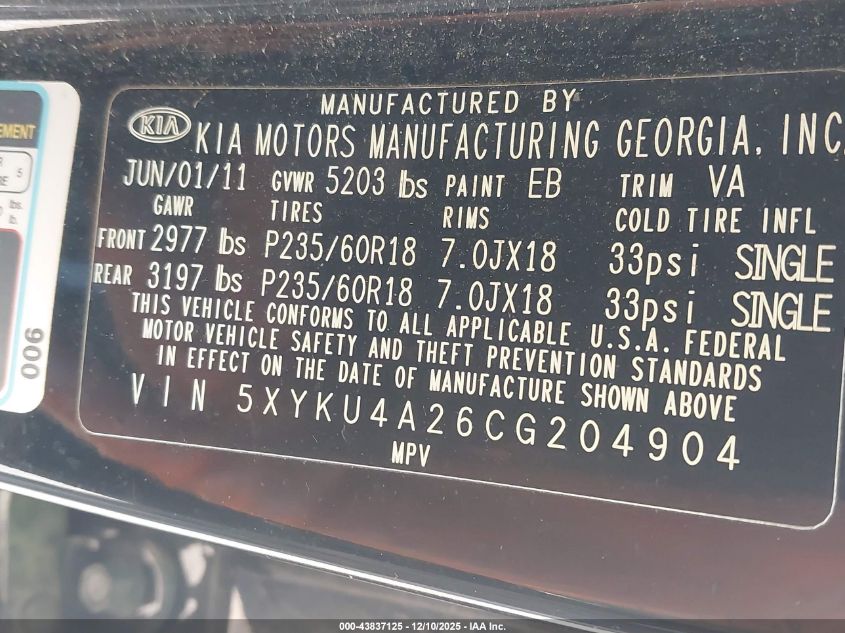 2012 KIA SORENTO - 5XYKU4A26CG204904, цвет - Черный, 3.5, Бензин, Передний привод из США
