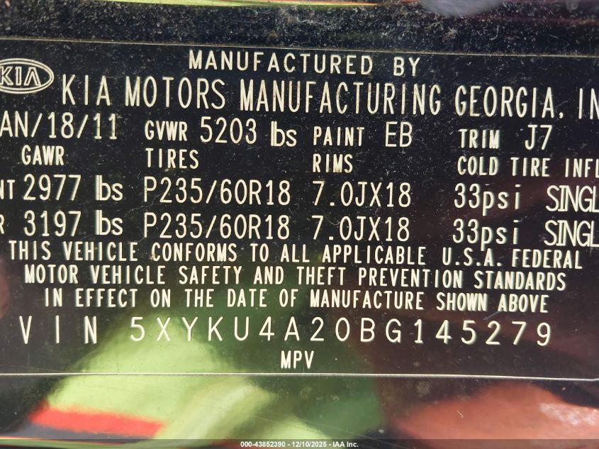 2011 KIA SORENTO - 5XYKU4A20BG145279, цвет - Черный, 3.5, Бензин, Передний привод из США