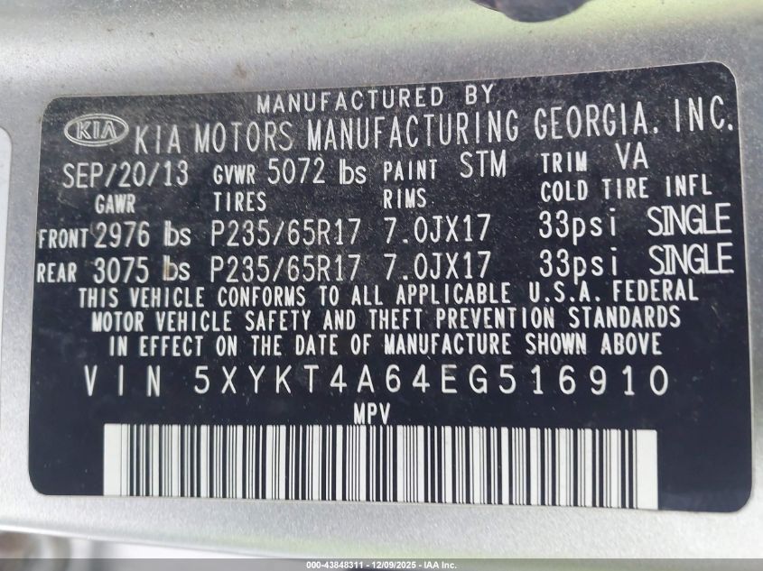 2014 KIA SORENTO - 5XYKT4A64EG516910, цвет - Серебряный, 2.4, Бензин, Передний привод из США