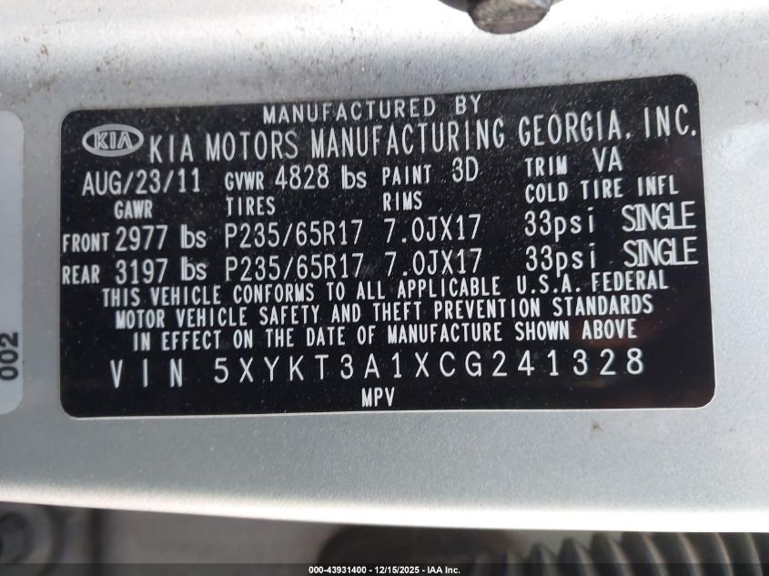 2012 KIA SORENTO - 5XYKT3A1XCG241328, цвет - , 2.4, Бензин, Передний привод из США