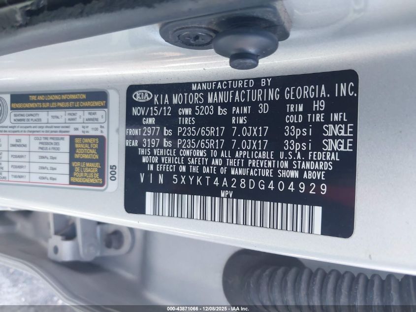 2013 KIA SORENTO - 5XYKT4A28DG404929, цвет - Серебряный, 3.5, Бензин, Передний привод из США