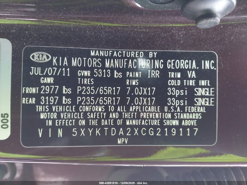 2012 KIA SORENTO - 5XYKTDA2XCG219117, цвет - Бордовый, 3.5, Бензин, Полный привод из США