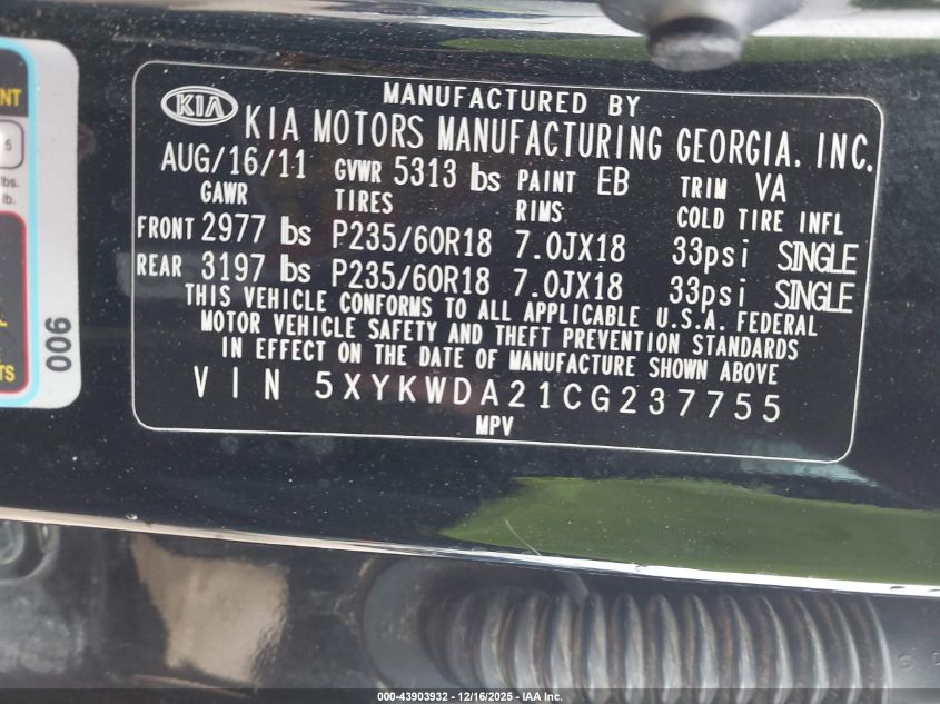 2012 KIA SORENTO - 5XYKWDA21CG237755, цвет - Черный, 3.5, Бензин, Полный привод из США