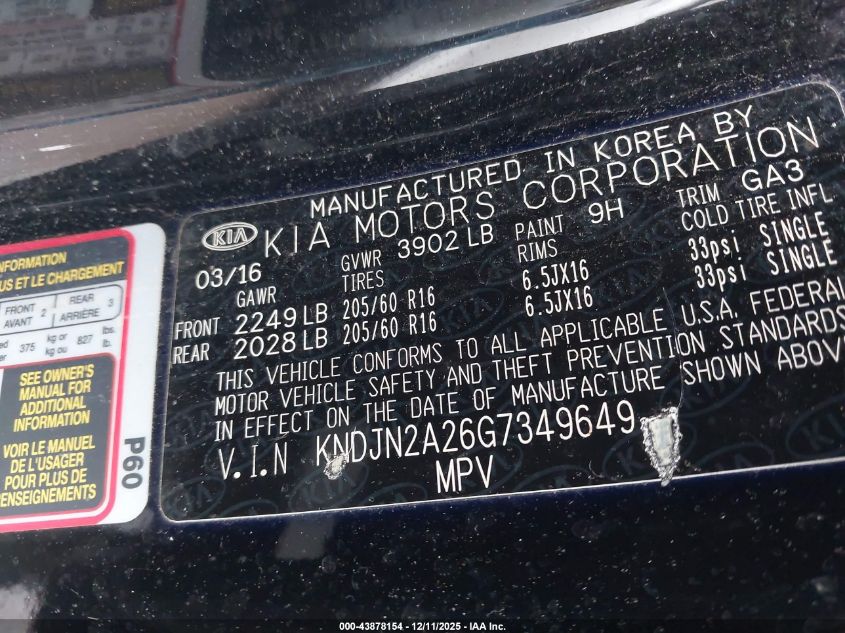 2016 KIA SOUL - KNDJN2A26G7349649, цвет - Черный, 1.6, Бензин, Передний привод из США