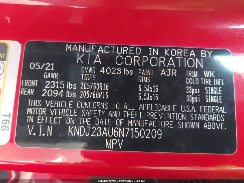 2022 KIA SOUL - KNDJ23AU6N7150209, цвет - Красный, 2.0, Бензин, Передний привод из США