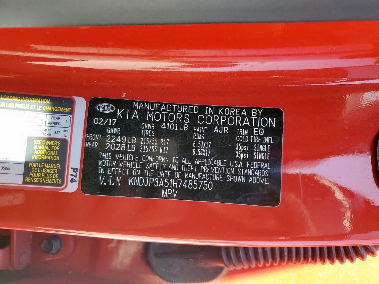 2017 KIA SOUL - KNDJP3A51H7485750, цвет - Красный, 2.0, Бензин, из США
