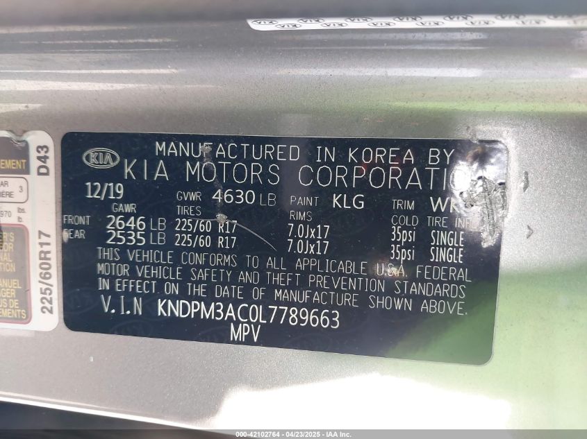 2020 KIA SPORTAGE - KNDPM3AC0L7789663, цвет - Серый, 2.4, Бензин, Передний привод из США